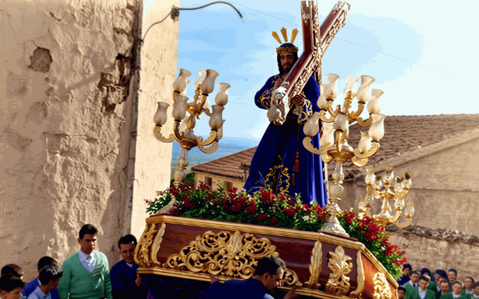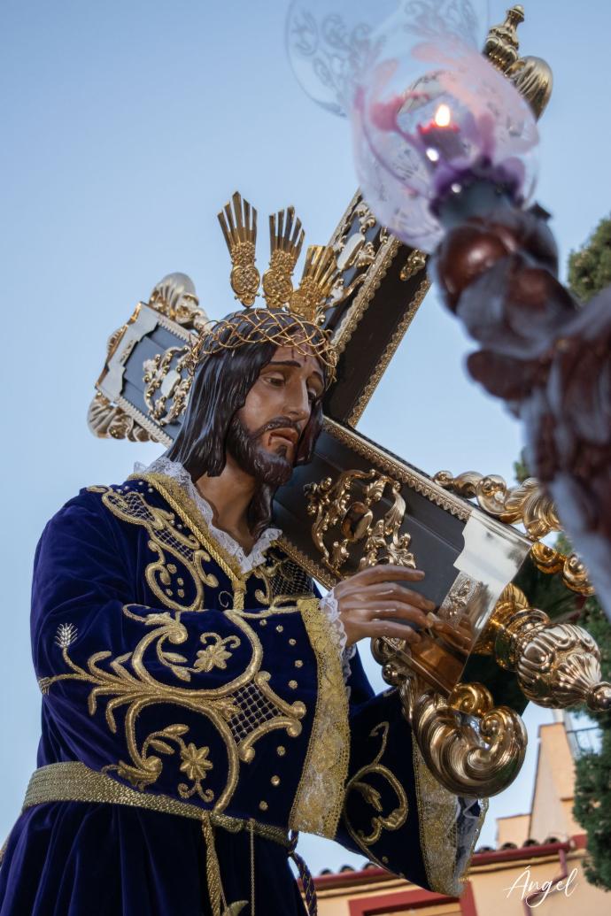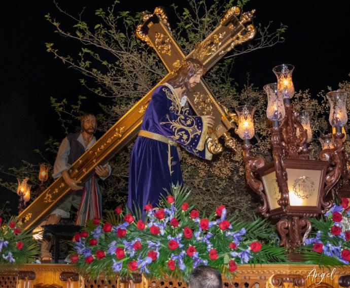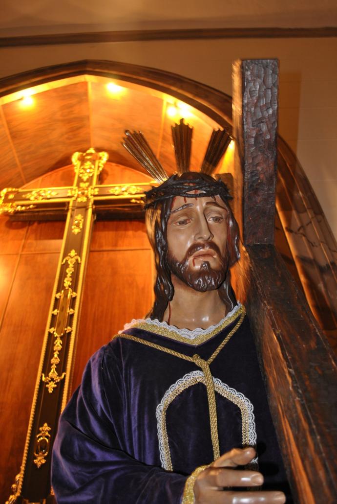 En su rostro se conjuga bondad y sufrimiento, encogiendo el corazón de quien lo mira. Sus manos se dirigen a sujetar la gran cruz que carga y la posición de de su cuerpo y pies unido al balanceo de sus costaleros parece que la imagen ande.